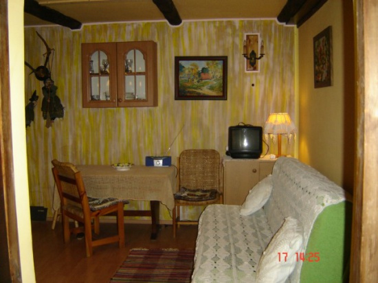 (kuchenka gazowa), lodówka, rozkładaną sofą, kominek, telewizor, radio.